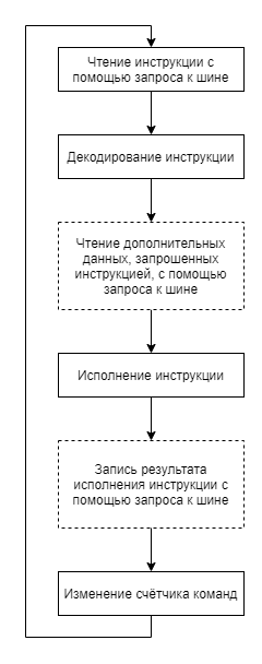 Откуда процессор получает инструкции, которые ему нужно исполнять? Из того или иного вида памяти (оперативной или постоянной). Любой процессор содержит внутри себя так называемый “счётчик команд”, который указывает на адрес команды, которая будет исполняться следующей. Процессор инициирует операцию чтения на шине, используя этой счётчик, и получает очередную команду, которая подвеграется декодированию и исполнению. В процессе исполнения команд могут быть выполнены дополнительные запросы к шине (как на чтение, так и на запись), зависящие от результата декодирования команды и состояния процессора. По окончании исполнения команды процессор переходит к следующей увеличивая свой счётчик команд на размер обработанной команды в байтах, однако некоторые команды могут приводить к иным изменениям счётчика команд. Такие команды называются командами перехода. Они бывают условные и безусловные.