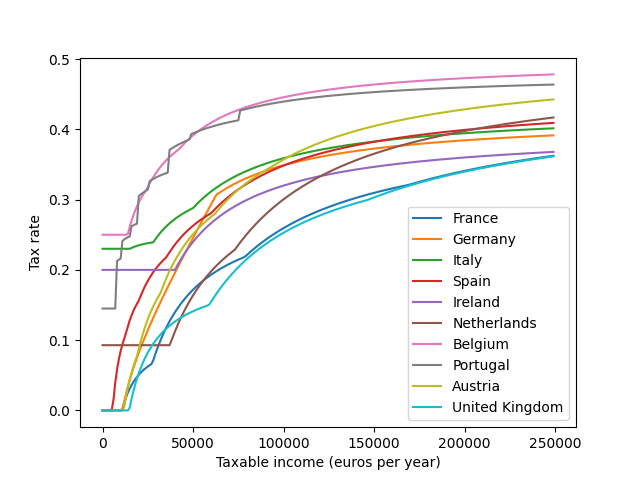 Рассмотрим диапазон зарплат от 1 евро до 250 тысяч евро в год. Это наиболее интересный диапазон, так как с одной стороны большинство смен порогов налогообложения происходит именно там, а ещё весьма маловероятно, что айтишник (как и вообще наёмный наботник, владелец же компании скорее всего будет применять множество техник по оптимизации налогообложения и будет платить не совсем НДФЛ) проживающий в одной из этих стран будет получать более 250 тысяч евро в год.