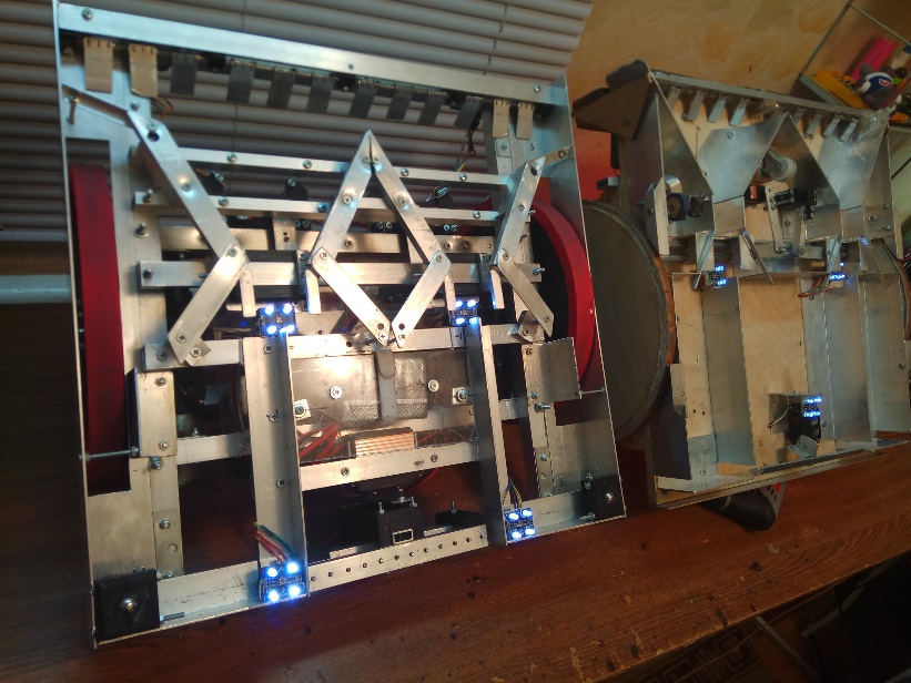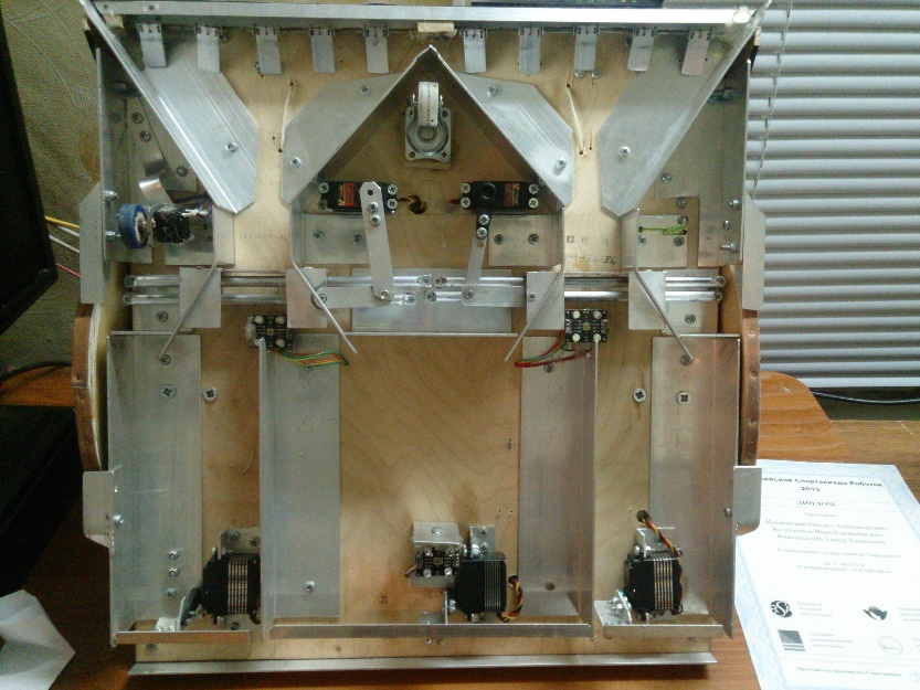Робот не имеет нижней стенки и шайбы движутся внутри него своим ходом за счёт движения робота. В какой-то момент они направляются в один из двух сортировочных механизмов, где датчик цвета определяет цветовую принадлежность подъехавшей шайбы и направляют её в центральный бункер, если шайба нашего цвета, и один из боковых бункеров, если нет.