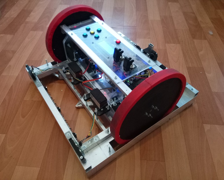 - 2 мотор-редуктора от автомобильных стеклоподъёмников (управляются драйверами BTS7960, также оборудованы оптическими энкодерами для реализации PID-регуляции скорости движения и навигации)